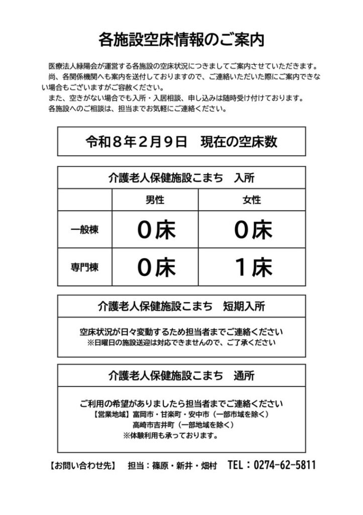 医療法人 緑陽会 各施設空床状況のご案内