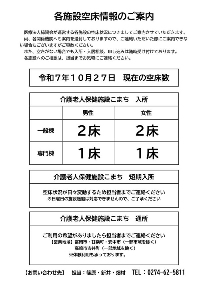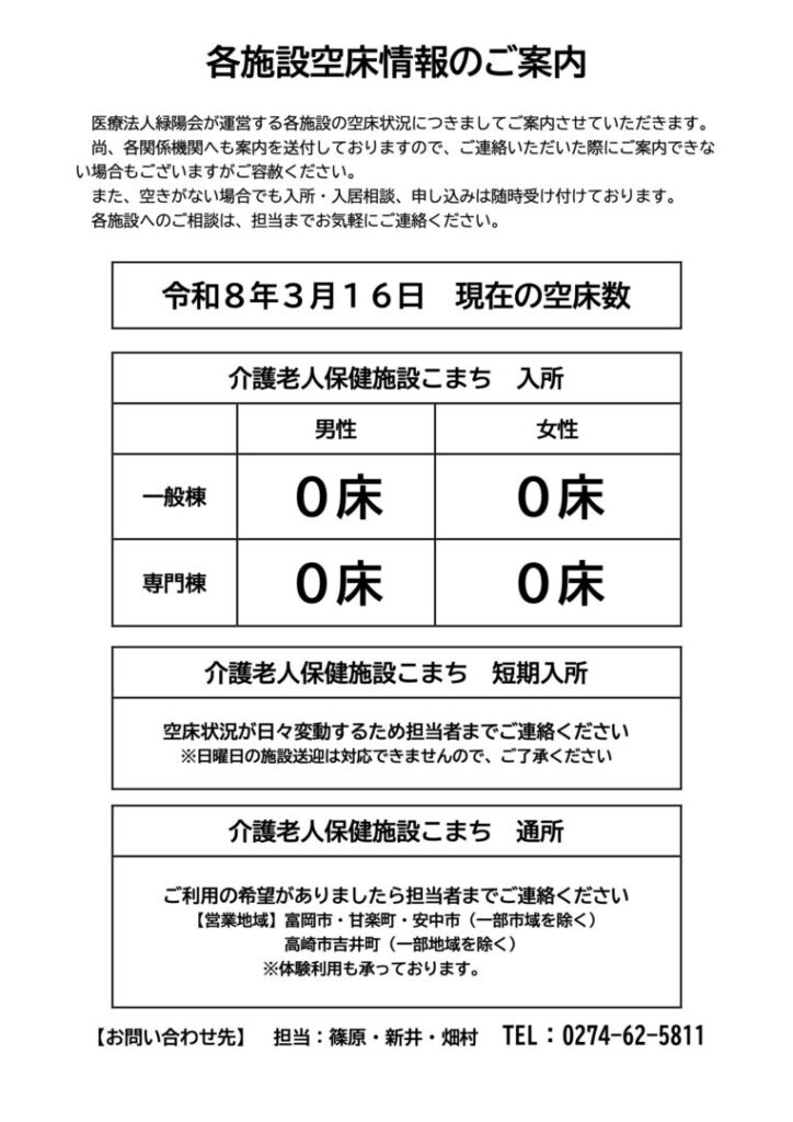 医療法人 緑陽会 各施設空床状況のご案内
