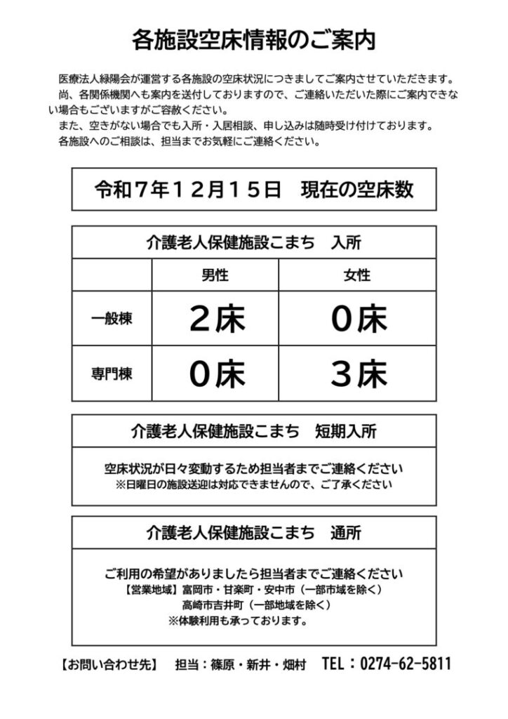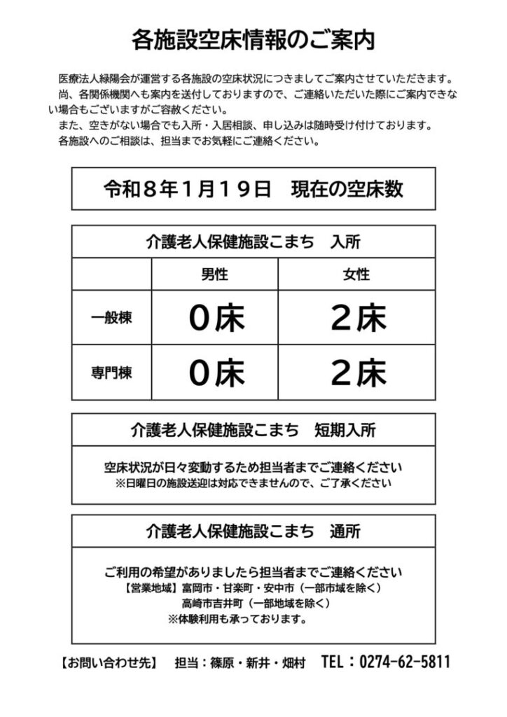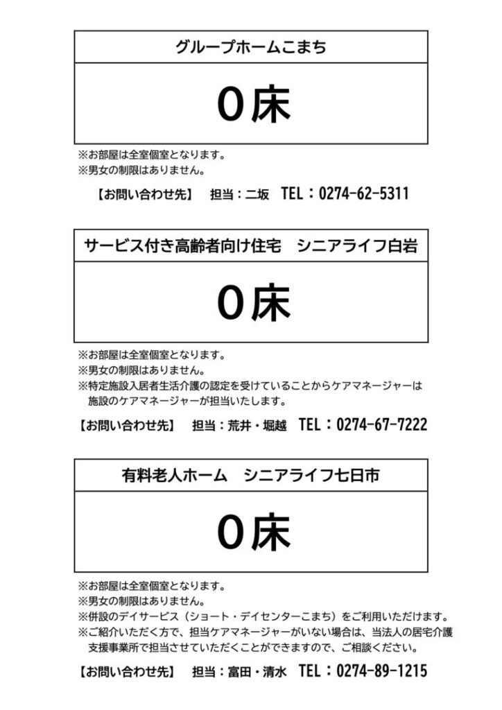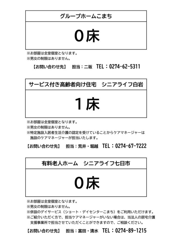 当法人施設の空床状況をご案内させて頂きますので、宜しくお願い致します。
